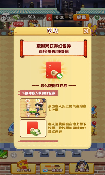 大富豪餐厅红包版是一款福利资源多多的模拟经营餐厅游戏,在这里只需要升级餐厅就行了,解锁出更多厨师,等级越高就可以吸引更多的客人,从中赚取更多的收益来得到红包,各种不同等级食谱能够起到的小费作用也是不同的。