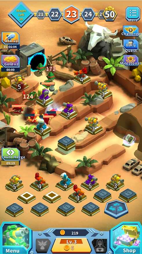 炮塔合并塔防游戏:强敌准备入侵我们的家园,去建设防御塔阻止他们的行动!这里有不同种类的塔可以建造,相同的进行合并后还能升级。一根手指就能玩的休闲游戏,没有复杂的操作,在建造完成后自动进行攻击,商店内还会出售各种道具来为你提供帮助,闯关超轻松,现在就来开始挑战一道道难关吧!