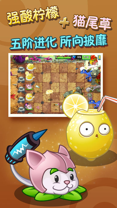 [柠檬猫尾 五阶进化]重磅消息!!! 两大力量强盛的橙色植物5阶强势登场!强酸柠檬,外表可爱呆萌,一旦上了战场便化身为杀伤力极强的攻击大佬。从天洒下的酸液能腐蚀机械,暴雨梨花针更是不容小觑,5阶还有超高伤害的柠檬片攻击,一击必中,稳如松。猫尾草说我很美,我也很强悍,收藏、战斗两不误!电击针刺不过瘾,看看能量豆大招电击能量柱,不行?那就使出最后的杀手锏,一颗芦苇箭,千军万马都不惧。5阶技能表示有我紫色芦苇箭在,前路无阻!