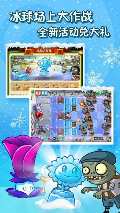 [冰球对战 不可错过]北国冰封万里雪飘,又到了南方人迫不及待看雪的时候啦~植物大战僵尸2将首次加入冰球元素游戏活动,南方的小僵僵们快看过来,娱乐版冰球大作战:一起在冰地上与僵尸来一场激烈的对抗赛吧!冰球大作战中,僵尸阵容与植物阵容展开激烈的搏杀,一场时间结束后进球一方多的获胜,看看哪一方更能突破对方的底线吧!冰球大作战不仅可以看到寒冰下炫彩夺目的植僵世界,还可以让更多小伙伴们体验冰球的魅力哦!活动入口就在双旦狂欢哦,小僵僵们赶紧来一场力量型的冰球PK吧!
