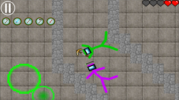 在我们之中对决游戏:这款游戏是以最简单的火柴人题材为主,超简单的题材和玩法,选择你想要使用的武器和角色,一场魔性的乱斗即将开始。场景中有很多危险的机关,如果你不小心触碰到的话可能会损失掉部分血量,所以要尽可能的小心,将对手血条清空后就能获得对决的胜利。