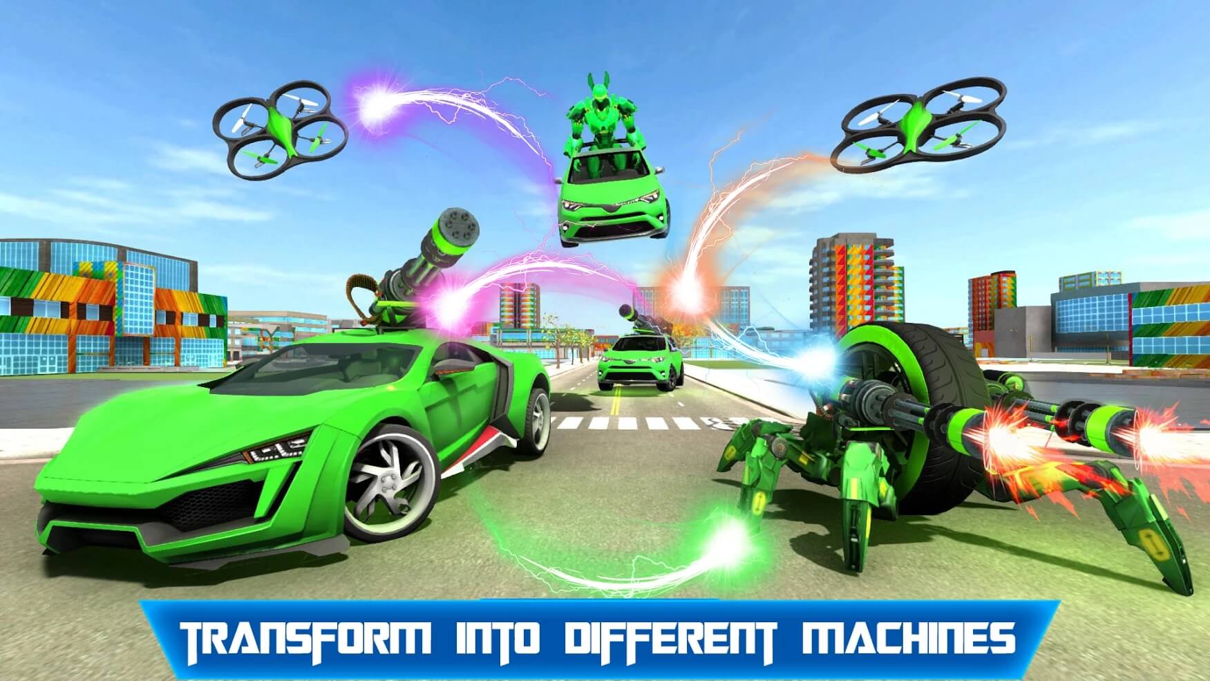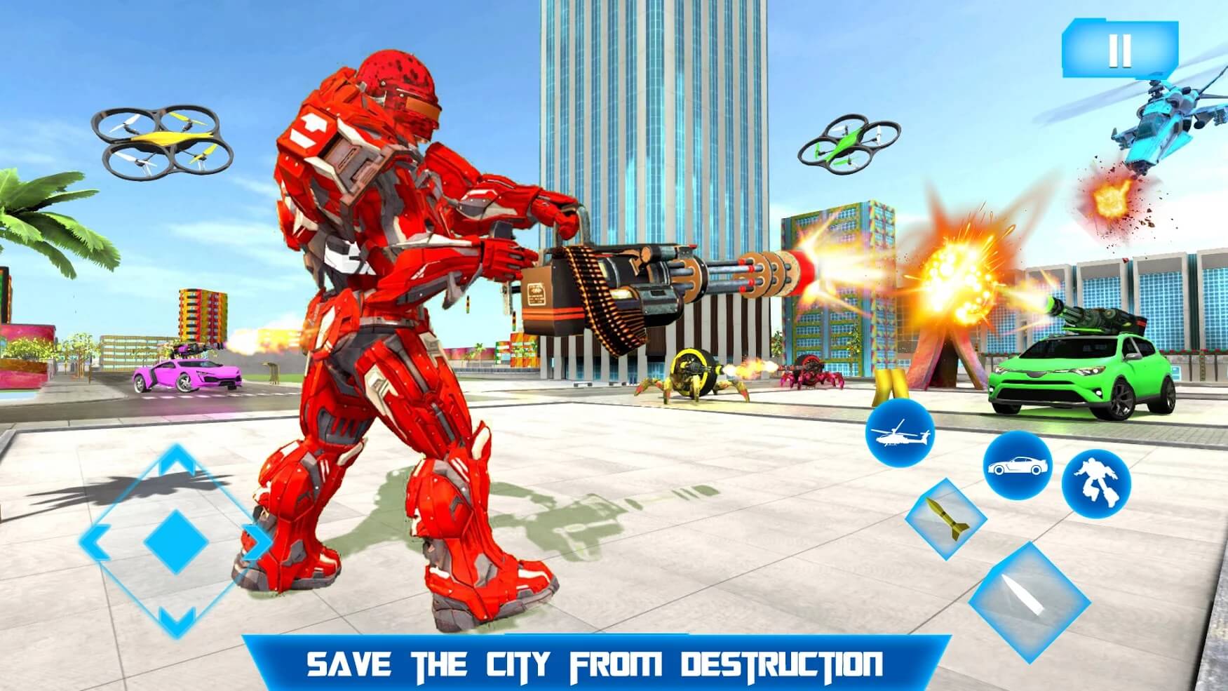 蜘蛛车轮机器人游戏是一款变身蜘蛛机甲射击类游戏,玩家们将控制一只蜘蛛形态的机器人,当然可以利用站立形态来进行攀爬,你的责任就是惩罚这个城市的所有坏人,通过击杀敌人来获得生命力以及蓝量的提升,开始你的爆破刺激性射击吧。