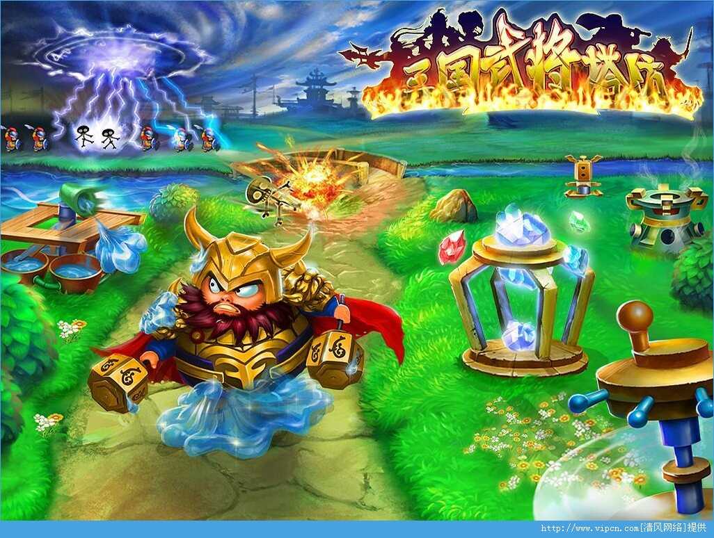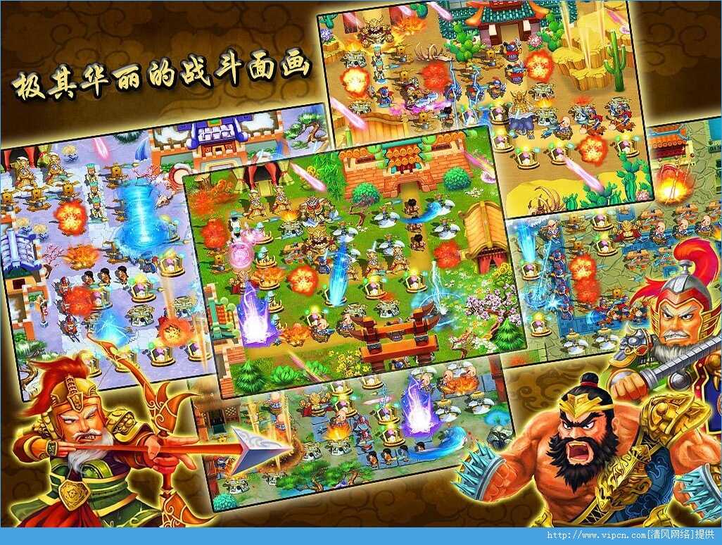 1、一款以三国为主题的塔防游戏,除了有精美的画面、丰富的关卡设置、多兵种的敌人;
