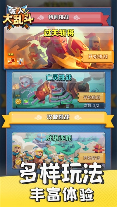 喊人大乱斗游戏是非常魔性的三国题材的大乱斗玩法游戏喊出你最喜欢英雄的名字加入到战斗中去吧,派出大量的士兵去赢得每一场战争的胜利,策略的对战玩法丰富的主题场景Q版的士兵等待玩家的招募组队,制定出各种策略,多人竞技比拼等你开启。