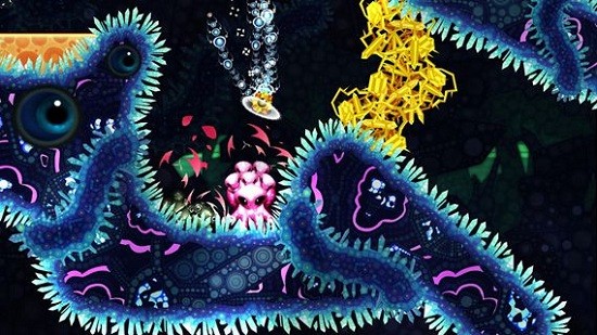 游戏画面真心奇幻,漆黑的背景,有一座绿莹莹的植物迷宫,那里生长着金色的圆球和金色的星星。一只巨大的透明水母停在迷宫的一处,计算着通往迷宫每一个角落的路线。玩家的任务就是帮助水母发射小水母,去“炸”掉那些金球和星星。