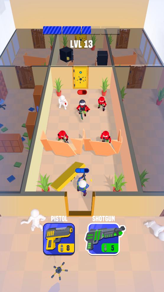 破门行动Door Kick Action是一款动作冒险射击潜行游戏,玩家负责敲开每一扇门,门后是危险的敌人,他们躲在掩体后方瞄准所有进入的恶人,躲避攻击和子弹消灭他们。