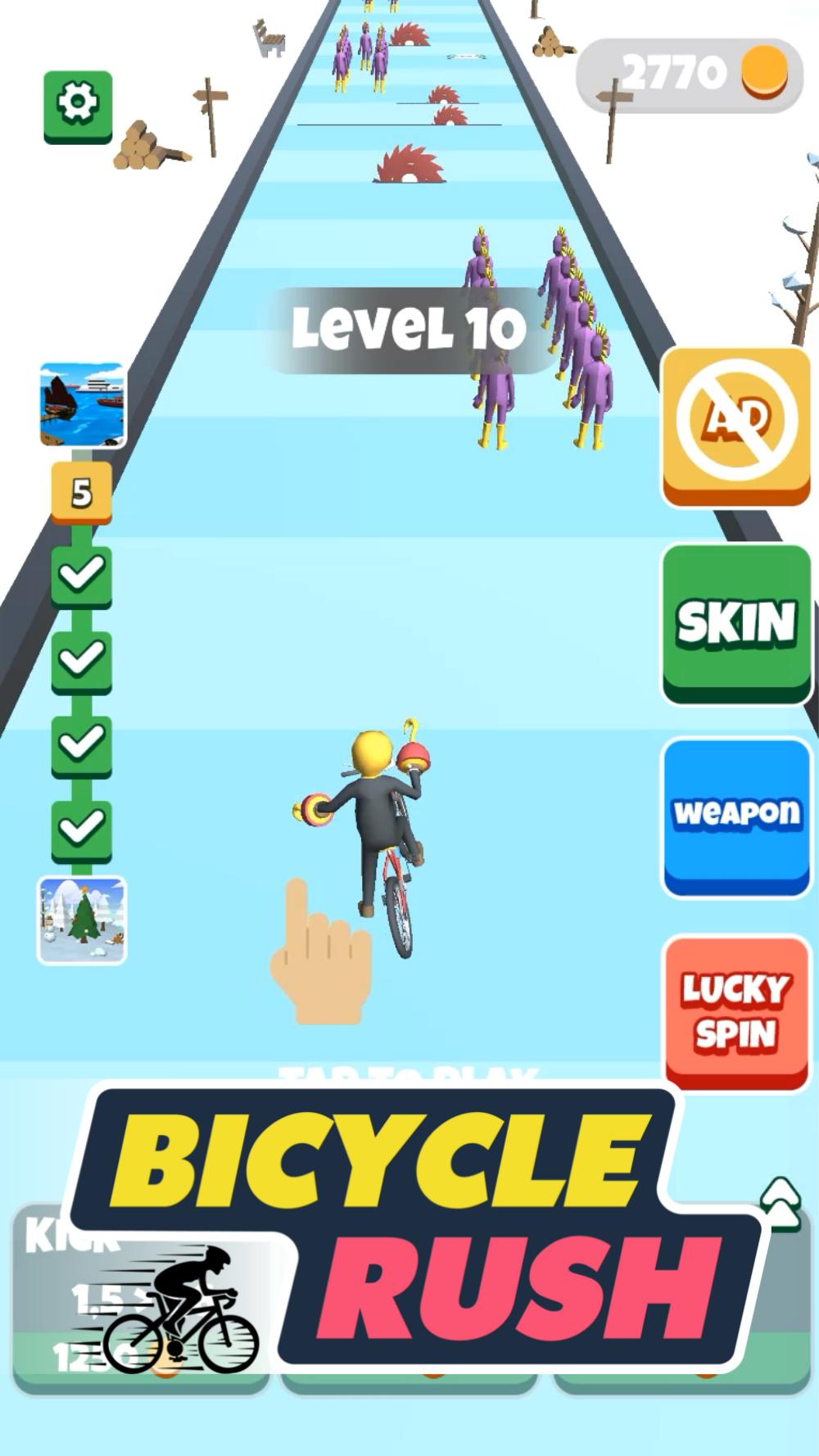 自行车冲刺Bicycle Rush是一款自行车跑酷冲刺游戏,骑自行车在道路上行驶,可以用有好看的新造型和武器,武器可以用来击打遇到的敌人,不要被敌人给拖住了,还要手机硬币用来兑换物品。