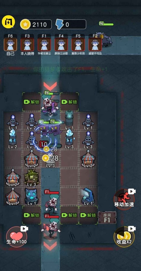 1、不断升级你的塔防来保护你的床。每个玩家有100HP,每次受到攻击都会扣除1滴,如果被清除则失败。