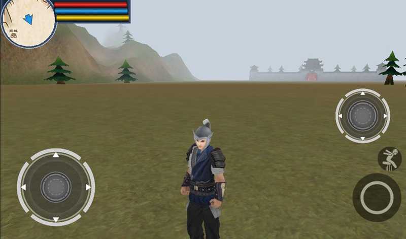 平时用屏幕左则的十字虚拟按键来控制主角的行走,屏幕右侧的确认按键来进行砍杀、对话等等。