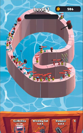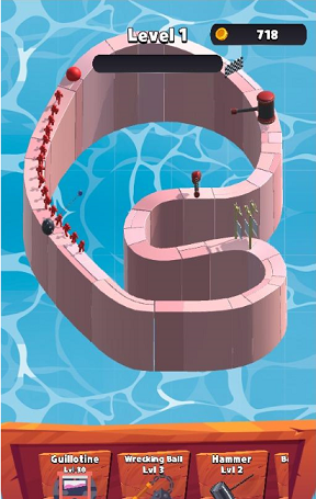 在一局关卡内,使用局内金币购买几种陷阱,如砍头台、大摆锤、拳击手套等等,将他们安放在小人的必经之路上,不要放过他们的任何一个人,将他们全部消灭,不过要注意一局中的陷阱只能放在一个位置,不能重复使用同一个陷阱。