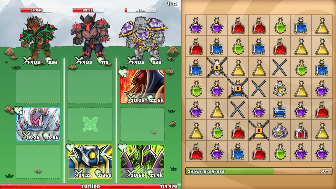 通过解决三消谜题来创建特殊组合以生成强大的英雄。