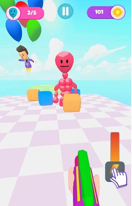 1、气球人过来后,点击屏幕进行射击,瞄准射击,点击气球人的头部。2、注意屏幕左侧的进度条。当能量充满时,它会爆发出惊人的力量。3、收集金币换取多款枪械皮肤,点击屏幕即可射击。