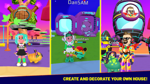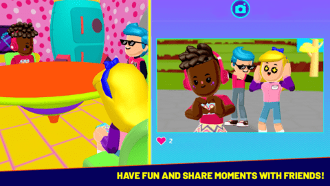 【与朋友交谈】这个世界是你的!除了探索和面对挑战,你还可以尝试不同的活动:在花车上放松,吃冰淇淋,随着能量的增加跳得很高,跳舞,和你的社区一起享受乐趣!