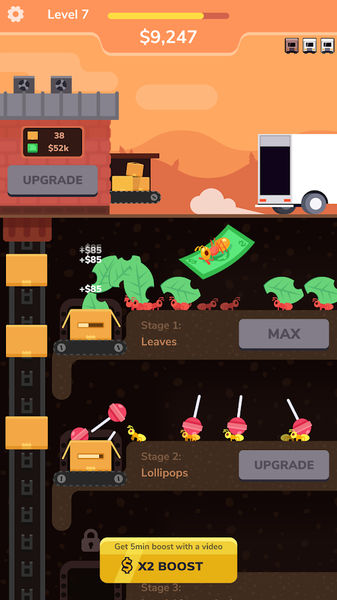 游戏简单容易上手,玩家只需要让蚂蚁不断帮助我们赚取金币,运用好赚取的金币获得更多的财富。