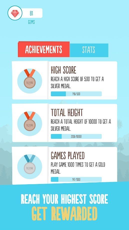 许多精彩有趣的小道具,花费一定钻石解锁并购买道具,它们可以再你攀爬的过程中起到很大的作用。千万不要停下来,因为你身下的洪水在不断的上涨,一旦你被水淹没,游戏就会结束了。