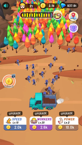 闲置伐木匠是一款非常有趣的模拟经营游戏使用金币可以帮你轻松的升级伐木工具,你需要控制自己的手下对树木进行砍伐,将伐木角色带到指定森林进行伐木活动即可,喜欢的朋友赶快在这里下载试试吧。