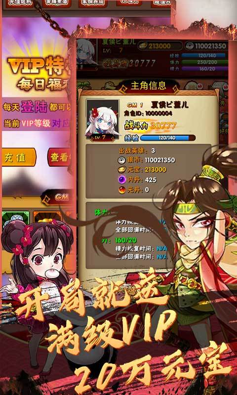 1.上线送满级VIP(超级VIP),20万元宝、银币1亿;充值比例1:1000,首充2倍!