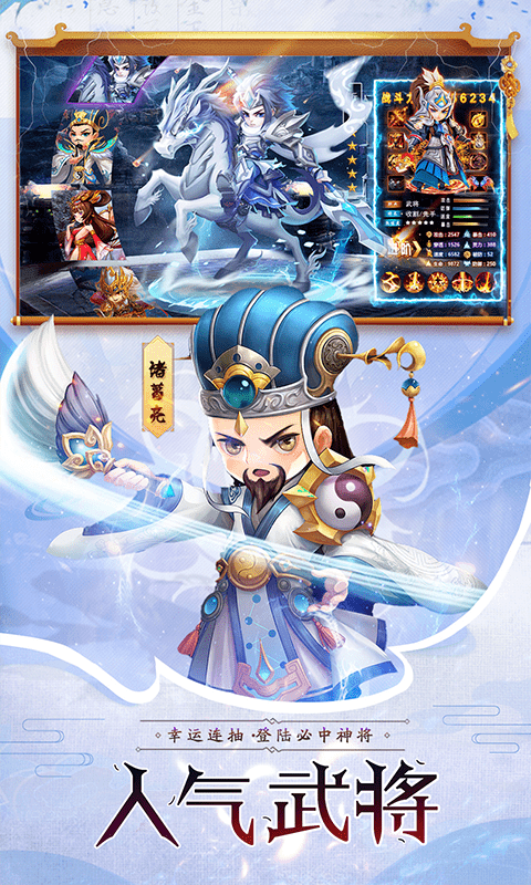 华丽阵容,超过150个三国名将可供免费招募,英勇无敌的关羽、足智多谋的诸葛、运筹帷幄的周瑜任您选择!