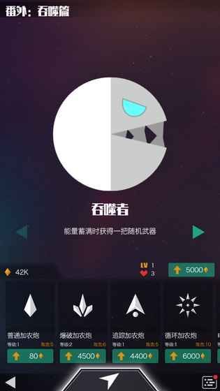 吃弹幕攒能量,攒满能量即可随机出一种武器或无敌时间!武器进攻Boss,无敌啃爆Boss!