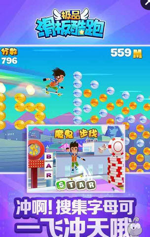 极品滑板酷跑是一款不一样的跑酷类手游修改为极品滑板酷跑本,这里你还可以收获双倍金币、飞行火箭、原力护盾、收集字母等提升道具呢,玩家进入游戏即可获得无限金币,游戏玩法比较简单,还不来本站下载试试吗?。