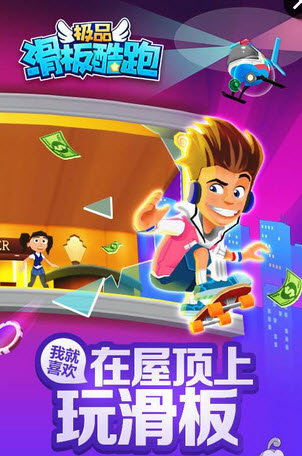 极品滑板酷跑是以滑板为主题的休闲跑酷游戏,美式风格的画风,画面大方华丽。背景为在高空屋顶与直升机展开一场惊险刺激的追逐,过程中有几率获得双倍金币、飞行火箭、原力护盾、收集字母等提升道具,同时还有可能遇到监控摄像机、飞弹、警示障碍等阻碍物;