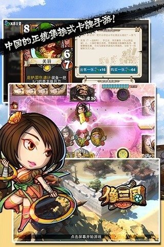 以三国创新微改编为题材的集换式策略卡牌游戏,抛弃了传统卡牌类游戏玩法,多达400+的海量卡牌收集、合成、兑换为主要卡牌玩法,强调牌组的组合及战斗的策略玩法。
