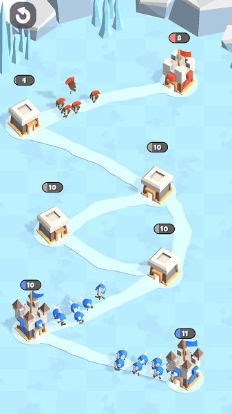 2,玩家根据不同的关卡采取不同的战术,占领地图上的所有堡垒以获得胜利,绿色堡垒属于玩家,挑战更多对手,赢得胜利。