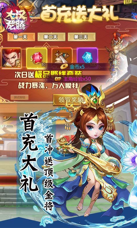 首充礼包霸气送天金神将吕布,次日送天金龙鳞套装,第三天送天金神将包,让你一飞冲天!