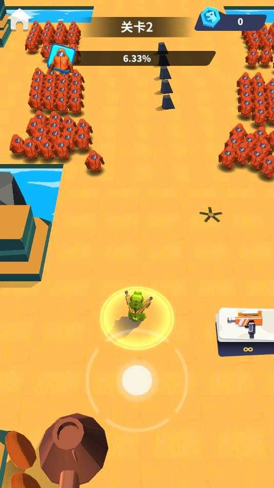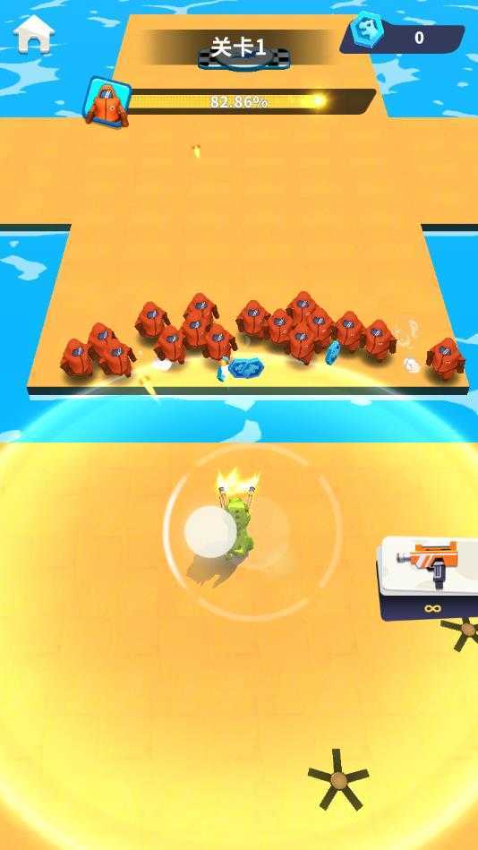 游戏操作是非常简单的,轻松就可以进行射击战斗操作,画风非常的卡通可爱,每一关卡都有着不一样的地形以及敌人数量。