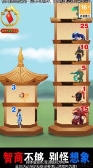3、塔防闯关爬塔展现技巧,队列布阵排列展现高强实力,抵御魔物拿红包。