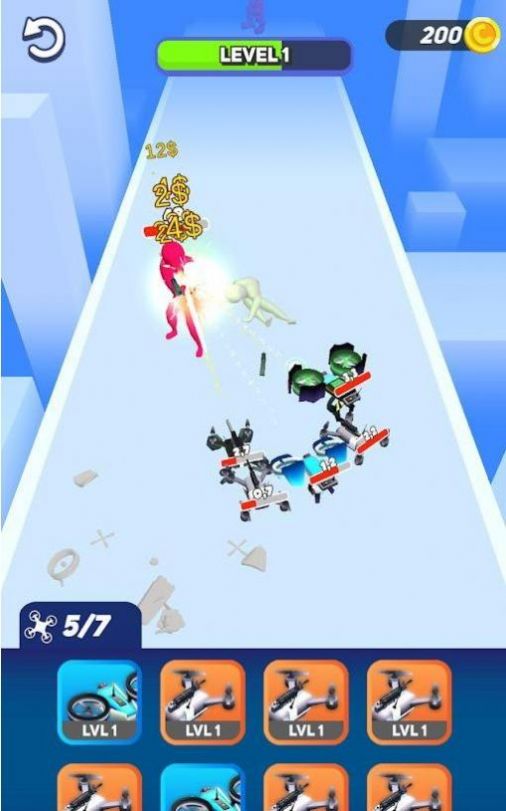 2、你需要完成不同的挑战来升级你的无人机,提升威力来消灭更多的敌人。