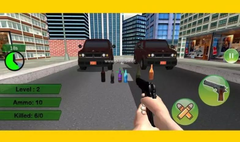 瞄准瓶子射击游戏是一款非常好玩的非常简单的射击类型的游戏,在这个游戏中为玩家们准备了超多的关卡,而在这些关卡中都有着很多的瓶子,而玩家要做的就是使用自己的枪械,去把关卡中的瓶子全部都击打碎掉,整体上玩起来还是非常的简单有趣的呢。