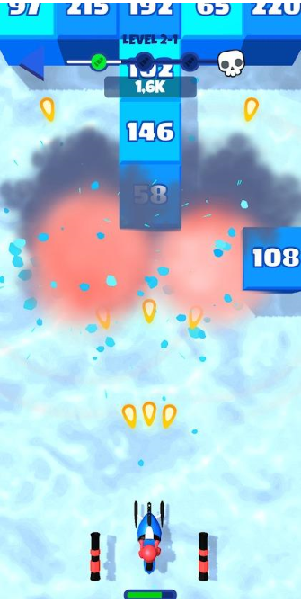 2、有些冰块中藏匿着更好的武器装备,当你打碎冰块闯过去后,会为你的射击装置升级,射出更好看的弹幕。