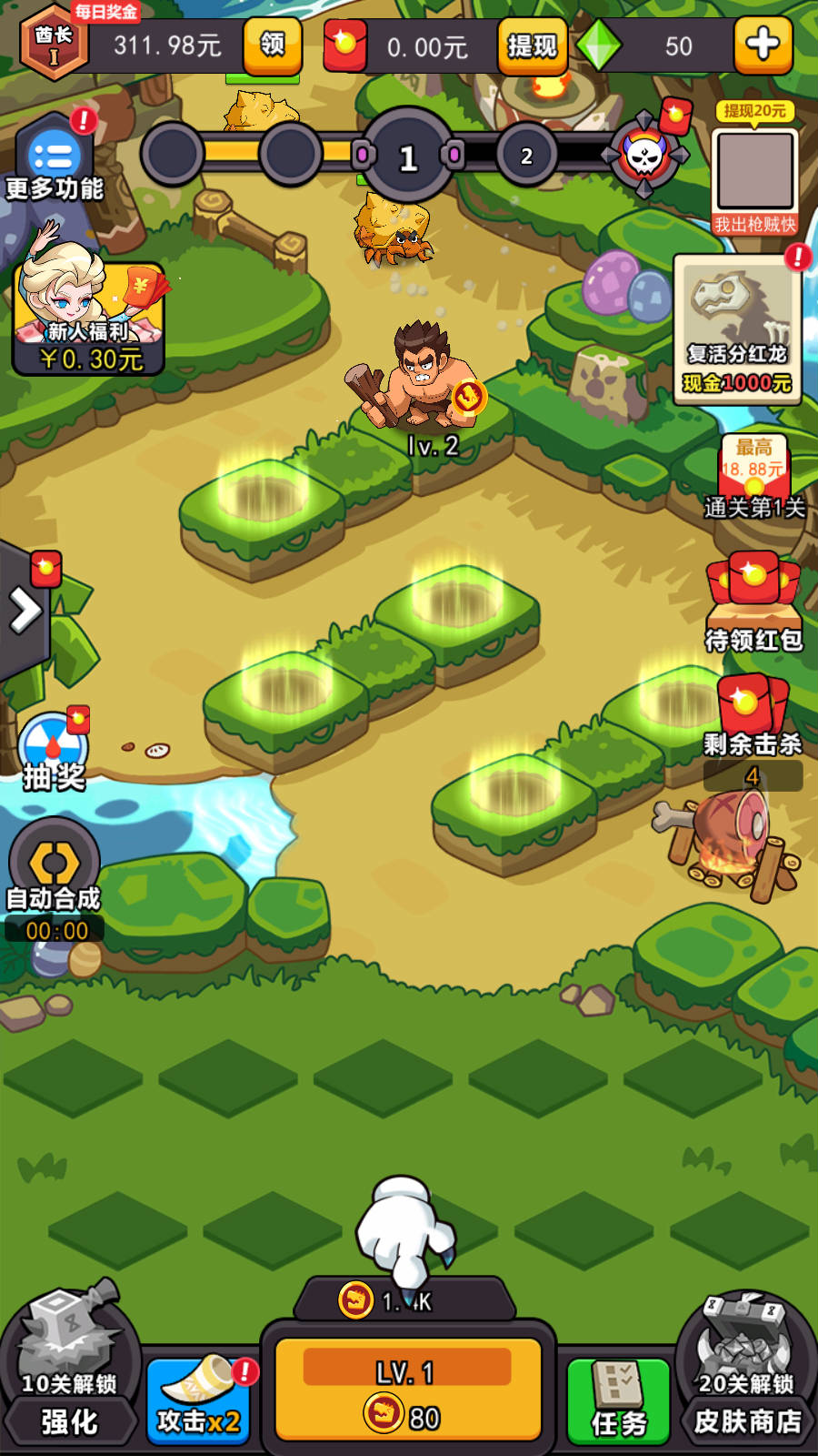 2、玩家不断的合成原始人,提高他们的等级,消灭掉怪物,完成任务,可领取丰厚的红包奖励。