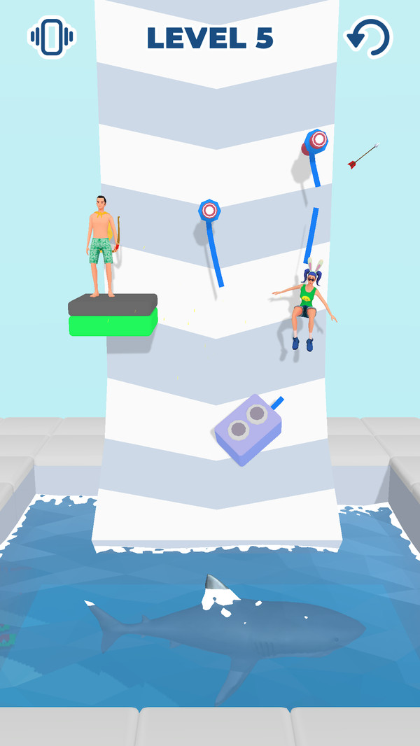 1、进入关卡,瞄准你要射击的方向,发出弓箭,射断绳子解救人员通关;