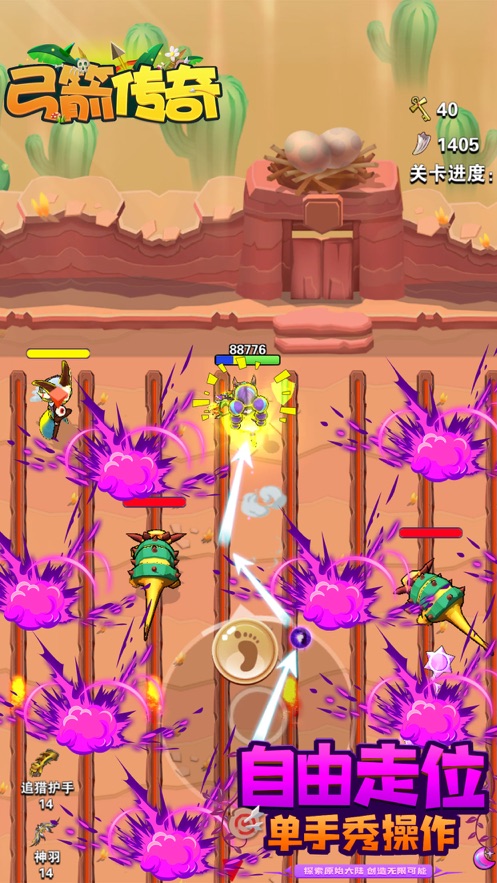 1、可以通过灵活走位避开敌人的各种攻击,抓住敌人攻击的间隙,快速射箭,利用无限的钻石和金币。