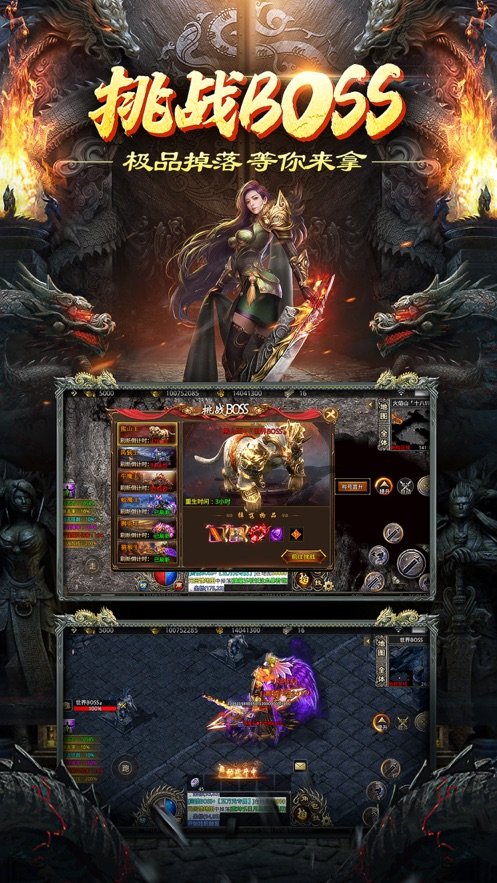 构建宏伟的传奇世界观,大型在线互动,万人即时热血对战,丰富玩法种类,点燃热血征程,铸就至尊传奇。