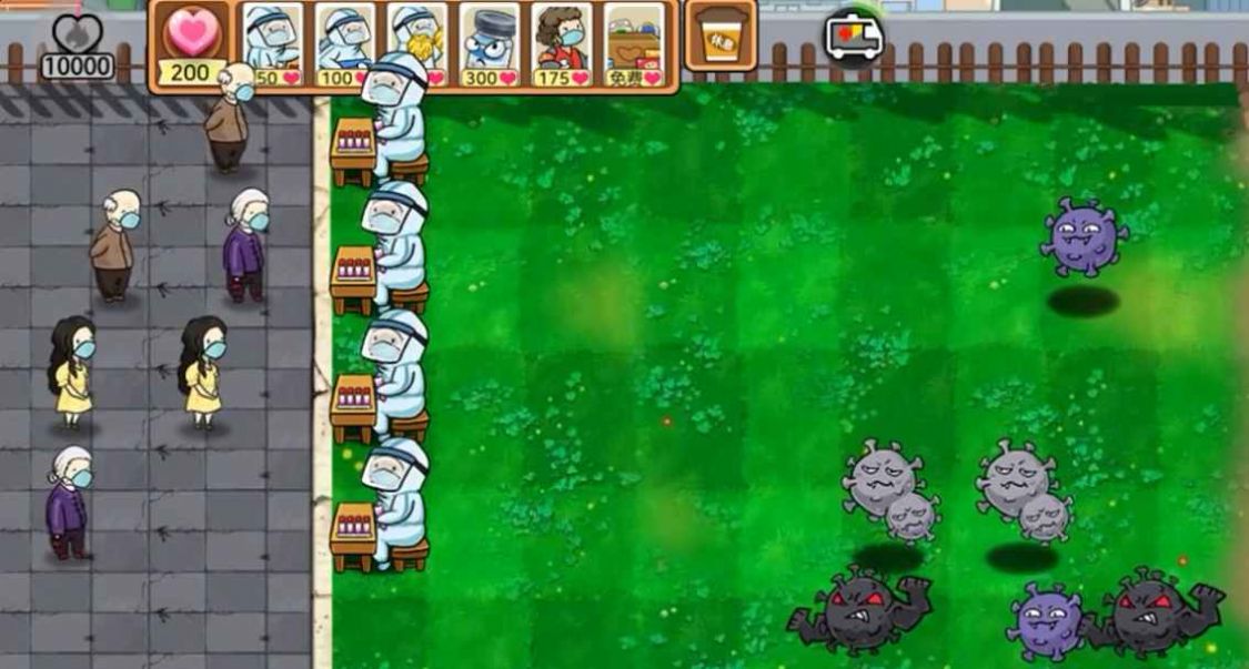 2、化身成为防疫英雄,抵挡病毒的进攻,玩法类似于塔防大作战。