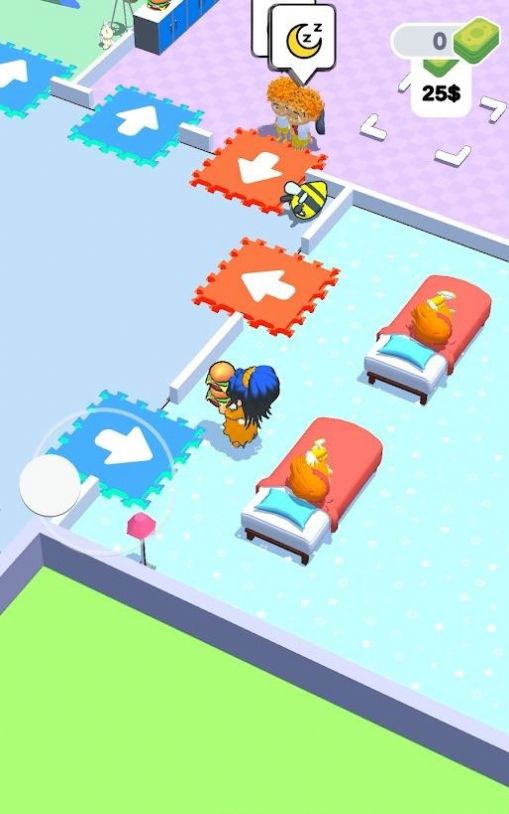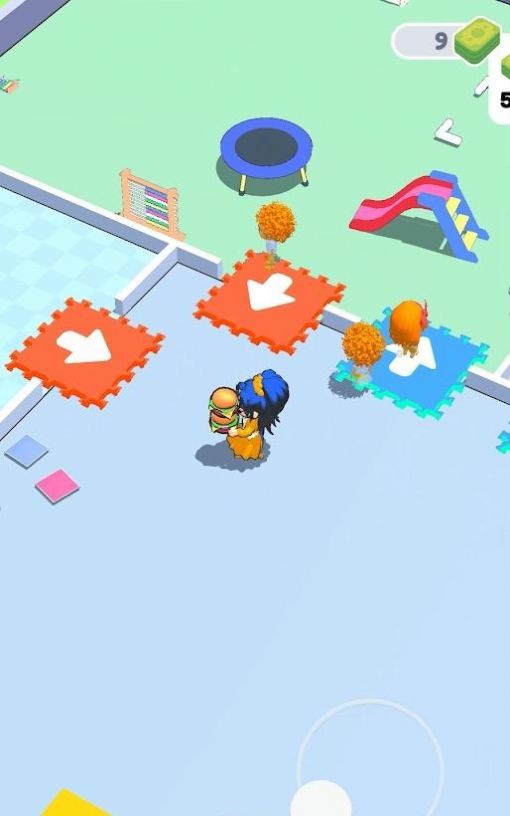 1、随意滑动屏幕控制角色移动,从基础开始做起,建造各种幼儿园设备;