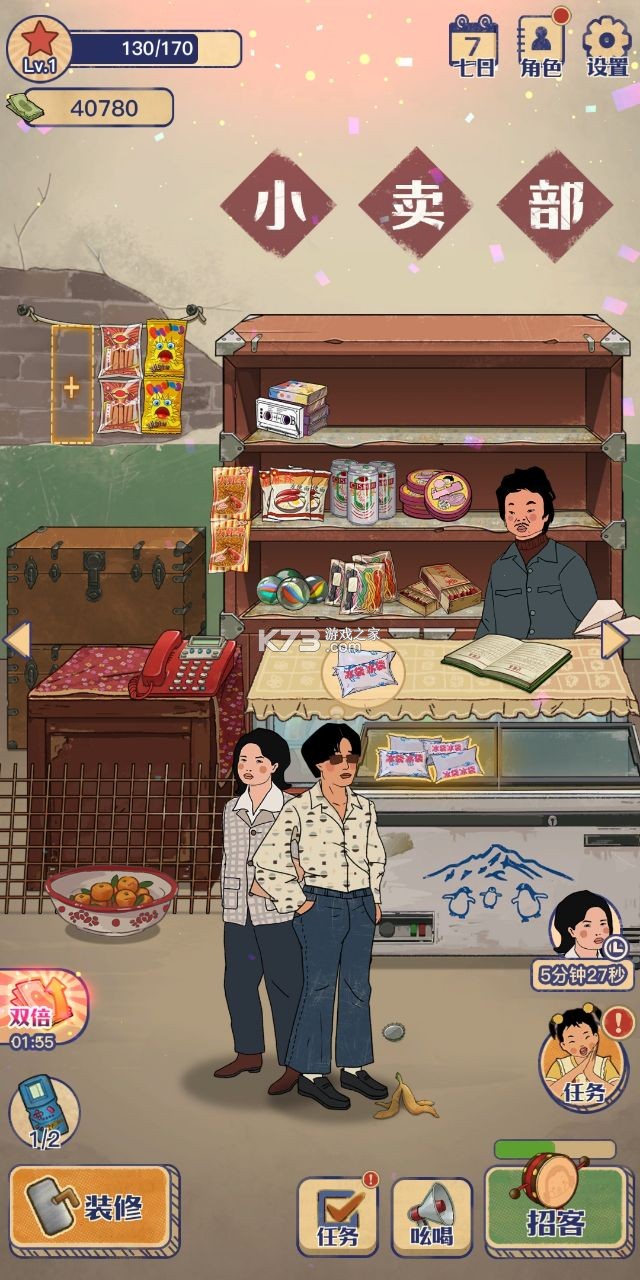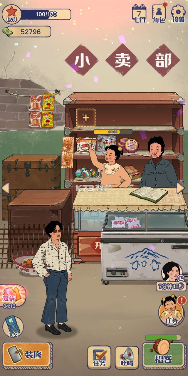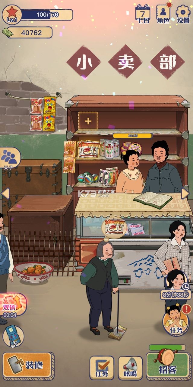游戏大致的玩法就是招募客人来买东西,我们玩家需要使用波浪鼓来招募客人,或者让王蓝莓在小卖部外面招募,当客人进来时 会有一个购物车按钮,点击一下客人会主动挑选小卖部内有的商品,有的客户挑选的时间非常短,有的客户挑选的时间非常长,当顾客挑选完毕后,我们只需要点击一下顾客想要的物品,就能自动给顾客了,当顾客拿到想要的物品后,会将钱扔在桌子上,我们只需要点击拾取就行了,到后期有些顾客会在我们这里订单,到达一定的时间后就可以领取了,通过我们卖东西赚的钱,可以继续进更多的物品以及升级小卖部,解锁小卖部的其他部分,将小卖部越做越大,这就是这个游戏的核心玩法。