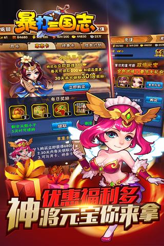 东汉末年,三国分立,烽火连天金戈不止,在那个世间争雄的年代,人命如草芥,群雄争霸,英雄辈出。《暴打三国志》便是以三国历史为蓝本,经数年研发而成的一款休闲娱乐类卡牌游戏。游戏将带大家进入三国战乱时代,玩家用自己的威望与实力招罗天下好汉,只需要手指轻轻点触屏幕即可暴打三国群雄,提升自己的实力,不断打败历史武将,让著名英雄人物臣服。