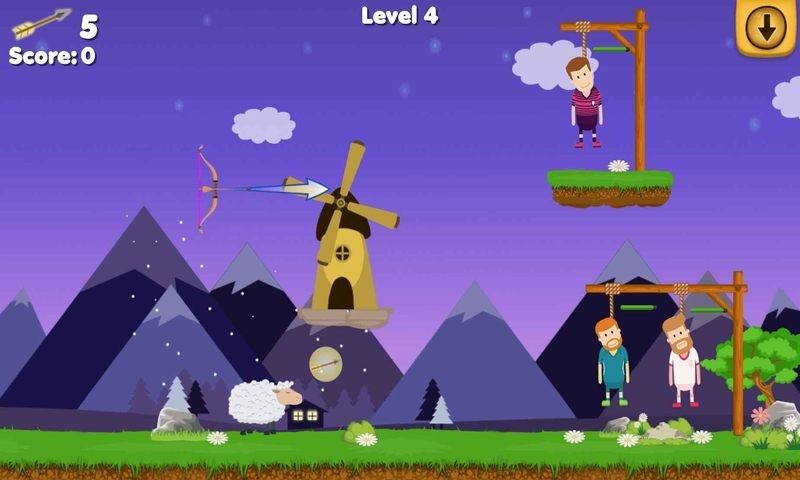 *出现在屏幕下方的一把弓箭需要去合理的控制,从而解救这个男人。
