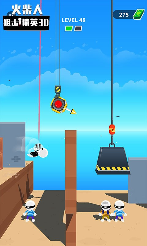 1、游戏的操作手法十分简单,只需要玩家控制火柴人找准角度射击绳子。
