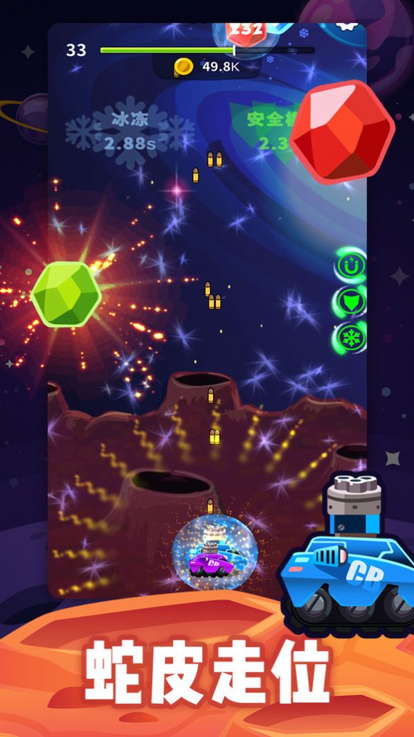 3、灵活的移动方向,不要让炮弹命中你哦,否则会造成失血过多而终止闯关的哦!