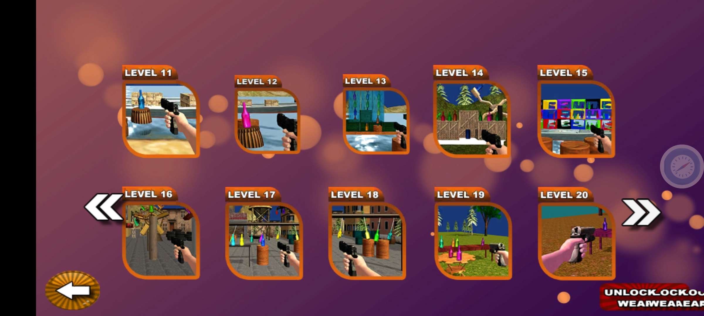 3、还有各种厉害的武器等你来挑选,击碎所有瓶子即可进入下一关。