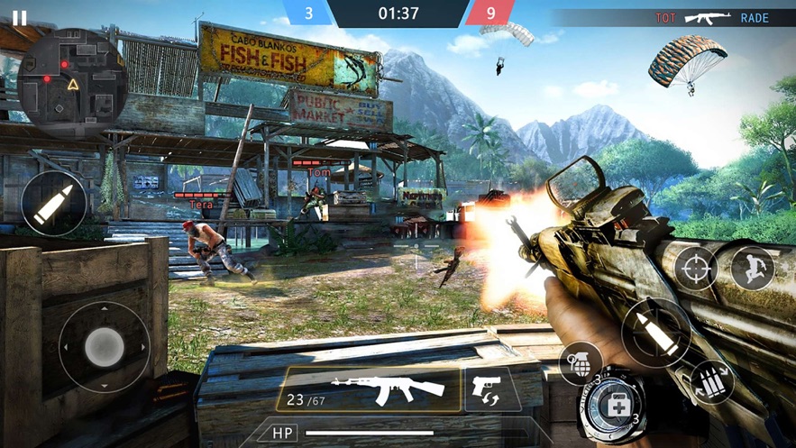 1、在战场上你需要找到机会去击败敌人,拿起武器瞄准射击干掉敌人;