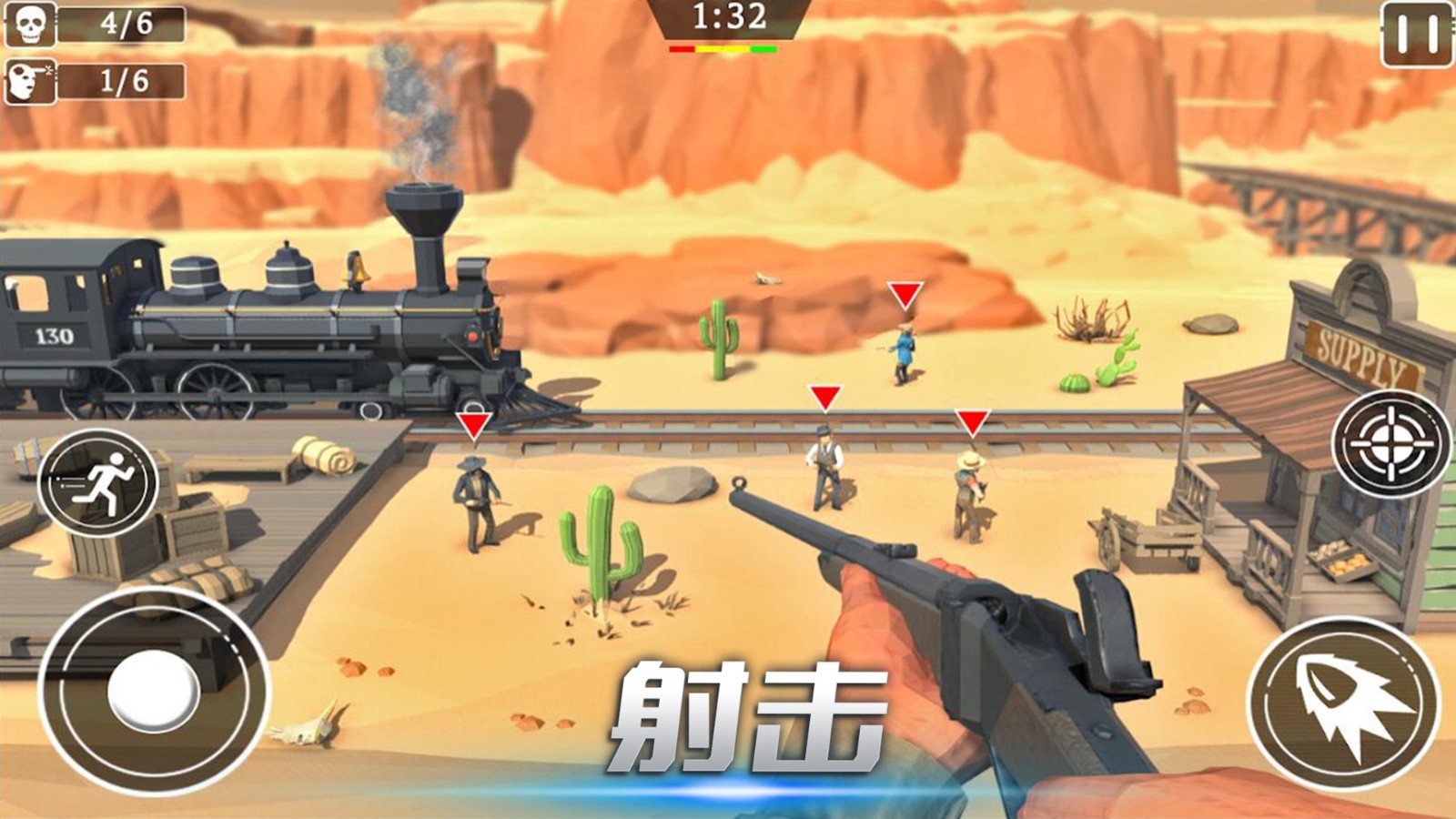 1、只需滑动屏幕控制准星对准目标,手枪就会自动开火,击破敌人。