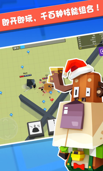 1、进入游戏后玩家就可以free选择自己的武器和技能,而且每次杀敌或者捡到的蓝色元素都可以升级哦。