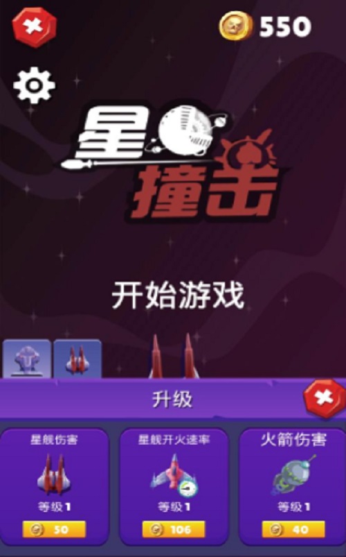 3、通过障碍物收集金币,无限提高飞船的射击速度,减少子弹和火箭的伤害,并成功快速突破障碍物。
