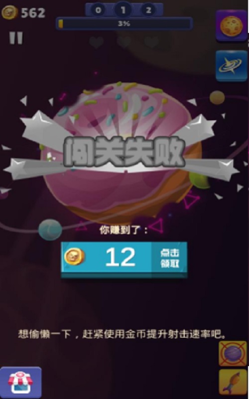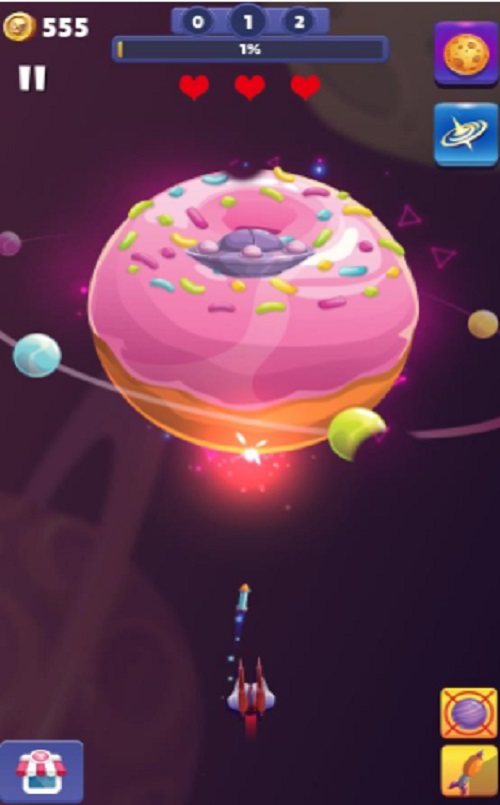 2、驾驶战舰发射子弹。糖果构成的星球非常脆弱。用子弹筛发泄愤怒。